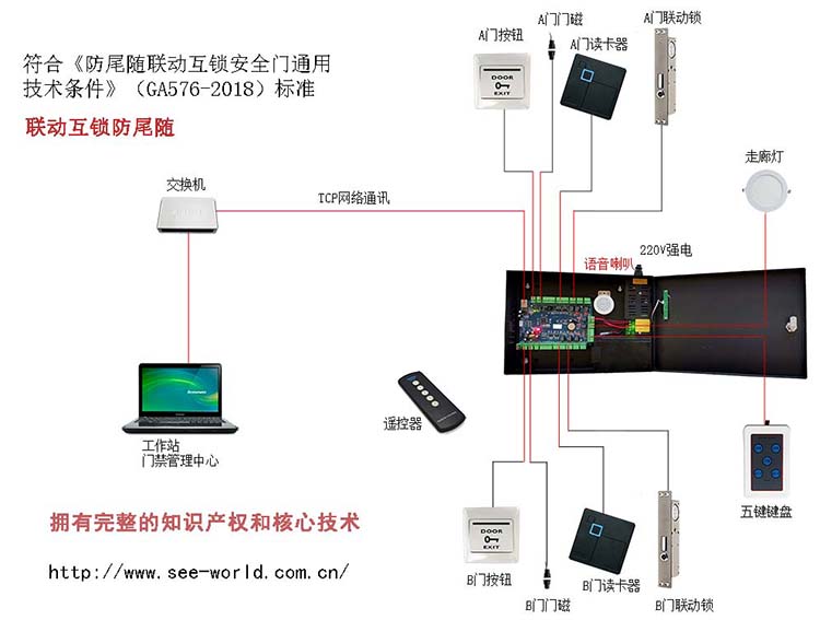 1、联动(或双门互锁)功能,如果一个门没关,另一个门绝对开不了 比如:外门没关,内门的读卡器或出门按钮无效,不能开门;系统要等外门关闭后,内门的读卡器或出门按钮才有响应,才能打开内门。 反之:内门没关,外门的读卡器或出门按钮无效,不能开门;系统要等内门关闭后,外门的读卡器或出门按钮才有响应,才能打开外门。 专用的联动锁,嵌入式电锁,钥匙也要做到互锁 2、多种开门方式,可选: (1)刷卡开门,(2)刷卡+密码开门,(3)密码开门,(4)出门按钮开门,(5)电脑远程开门, (6)五键键盘开门,(7)五键遥控器开门,(8)钥匙开门 3、五键键盘的特殊功能 ●全开:按全开按钮,系统使两门处于全开状态。语音提示用户:门已全开。两门开5秒后自动复位,系统返回正常工作状态(如果有一个门打开时,全开键也能起作用)。 ●全锁:按全锁按钮,系统使两门一直处于全锁状态。语音提示用户:门已全锁。两门全锁时,外门,内门的密码键盘,以及两个门边的出门按钮均失效,两门无法打开。只有通过联动按钮解除,使系统返回正常工作状态。 ●联动:按联动按钮,使系统从全锁功能状态、非法用户报警功能状态、胁迫密码报警(明或暗密码报警)后的全锁状态,回到正常工作状态。 ●开外门:按开外门按钮,语音提示用户:外门已开。(相当于外门出门按钮,要联动,即当外门开时,内门不能开) ●开内门:按开内门按钮,语音提示用户:内门已开。(相当于内门出门按钮,要联动,即当内门开时,外门不能开) 注:以上门打开指的是门锁的状态,并非门的状态 4、五键遥控器的特殊功能,等同五键键盘的功能 5、紧急制动(双门全锁死)/双门全开功能。 6、胁迫报警 当工作人员被人胁迫要求打开门的时候,工作人员可以在密码键盘上输入胁迫密码,门被打开,工作人员的人身不会受到老羞成怒的歹徒的伤害,而总控制中心的软件监控界面上已经显示出该地点有被胁迫开门的报警信息,并采取措施,提醒值班工作人员及时注意。 7、非法用户报警功能,如果连续出现5个非法用户,声光报警器发出报警信号,并且系统自动锁死5分钟,然后恢复正常,或者用联动键恢复正常 8、门没关报警,出厂时为3秒(可通过软件设置);门打开3秒之后,上锁,但若门磁检测到门未关闭,就报警。如果是非法破门也会报警。 9、通道灯控制,接一个12VDC的LED灯,门开即点亮,点亮一分钟自动熄灭。 10、语音播报功能。当门开时,播报:请关好门,一直播报到门关好为止 11、可以升级为多种状态的语音播报。提示用户:外门已开、内门已开、门已全开、门已全锁、请关内门、请关外门等门状态信息。 具体如下 ●当正常开启外门时,语音提示:外门已开 ●当用户打开门后,必须在规定的时间内关好外门(规定关门的时间,即门状态报警时间可设),否则,语音提示用户:请关外门 ●当正常开启内门时,语音提示:内门已开 ●当用户打开门后,必须在规定的时间内关好内门(规定关门的时间,即门状态报警时间可设),否则,语音提示用户:请关内门 ●当用五键键盘的全开键开门时,语音提示:门已全开。 ●当用五键键盘的全锁键时,语音提示:门已全锁。 当然也可以根据用户的需求定制语音播报 12、组网方式,TCP/IP网络型, 13、门禁软件实时数据采集,实时电子地图监控,实时显示记录